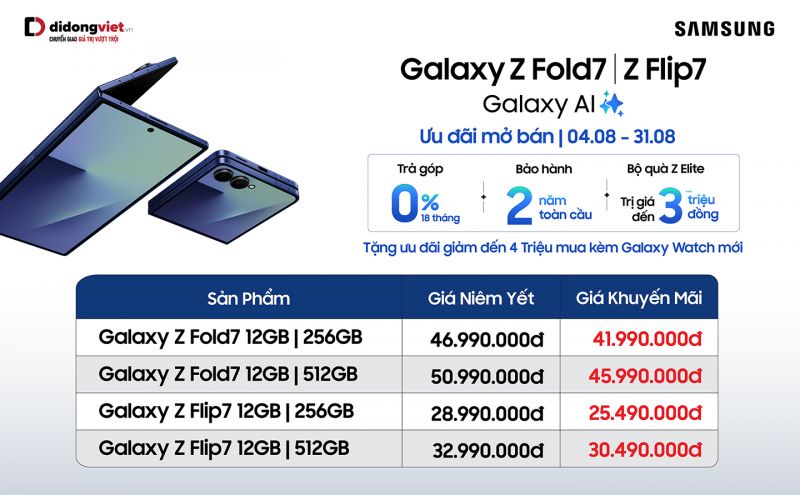 Hiện Samsung Galaxy Z Fold7, Z Flip7 đang được bán chính thức tại hệ thống Di Động Việt với mức giá sau ưu đãi chỉ từ 25,99 triệu đồng với Galaxy Z Flip7 và 41,99 triệu đồng cho Galaxy Z Fold7.