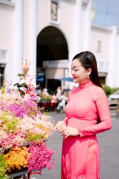 Hoa hậu Hoàng Thanh Nga diện áo dài sắc ngọt ngào bên hoa tại chợ Bến Thành