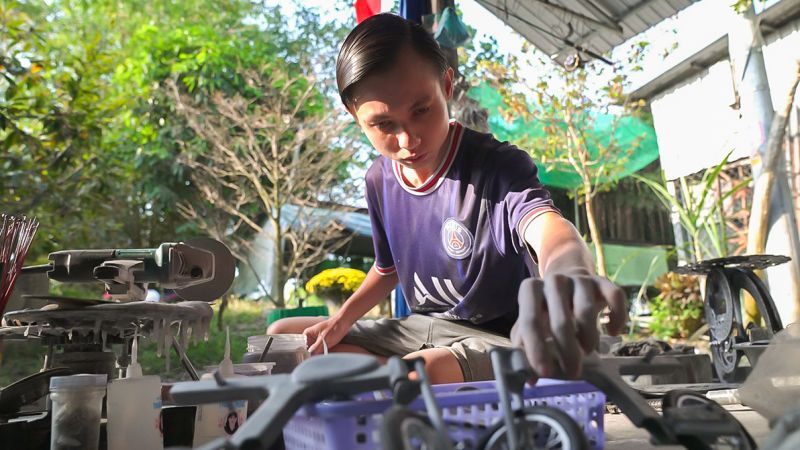 Dù chẳng thể nghe, chẳng thể nói, nhưng tâm hồn Phát lại cực kỳ nhạy cảm với những nhịp đập của máy móc. Em có thể ngồi hàng giờ quan sát từng con ốc vít, từng bộ khung xe đạp, xe máy. Tiệm phế liệu trở thành nơi để sáng tạo, nơi em nhặt nhạnh từng ống nhựa, mẩu gỗ, dây kẽm để thổi hồn vào chúng.