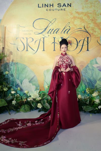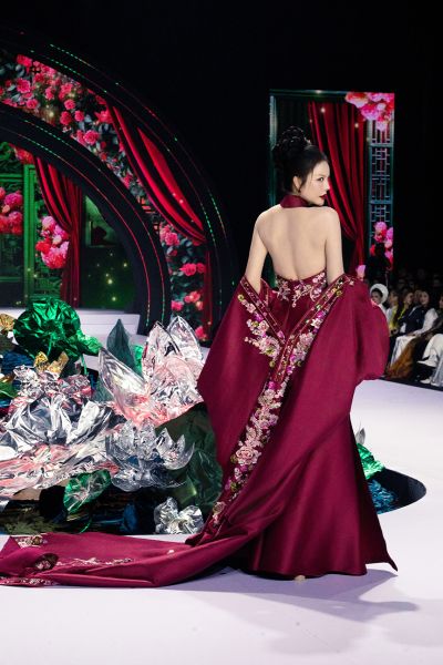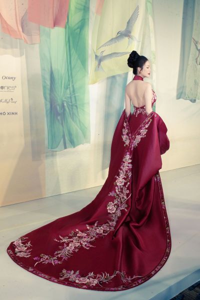 bộ áo dài cách tân với chi tiết cổ yếm tinh tế – một biểu tượng của sự quyến rũ kín đáo trong văn hóa Việt Nam. Chiếc áo dài cổ yếm đỏ thắm đã phát huy tối đa lợi thế hình thể của cô, khoe khéo bờ vai thon thả và tấm lưng ngọc ngà, nhưng vẫn giữ được sự cao sang, đài các cần thiết cho một sàn diễn thời trang cao cấp.