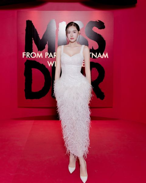 Bên cạnh đó, hàng ngàn sợi lông vũ trắng đã được đính kết tỉ mỉ tạo ra một kết cấu 3D mềm mại, bồng bềnh mà còn mang lại sự chuyển động sống động và ấn tượng cho mỗi bước đi của Á hậu.