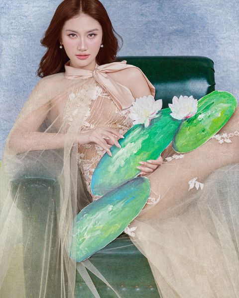 Với ba trang phục khác nhau, bộ ảnh được triển khai trên cùng một mạch thị giác, thống nhất về tinh thần nhưng đa dạng trong cách thể hiện. Ở layout đầu tiên, Hoa hậu Phương Linh xuất hiện trong thiết kế corset tông vàng kết hợp chân váy ngắn, gợi nên hình ảnh một “nàng thơ Hoàn Vũ” với năng lượng nhẹ nhàng, cuốn hút. Không gian được xử lý như một bức tranh vẽ tay, tạo cảm giác mềm mại và gần gũi.