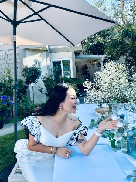 Ngọc Ánh Kim diện chiếc đầm trắng với phần tay bồng cách điệu cách điệu hình đôi bướm tôn lên vẻ đẹp sang trọng rạng ngời và quyến rũ khi khoe trọn chiếc cổ cao và bờ vai mượt mà. Chiếc đầm do người bạn thân NTK Giang Kyo dành tặng Ngọc Ánh Kim nhân dịp khai trương nhưng do ảnh hưởng covid không thực hiện được nên giờ cô nàng diện vào dịp sinh nhật trắng của mình.