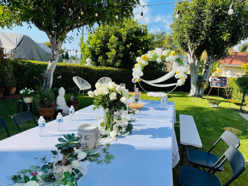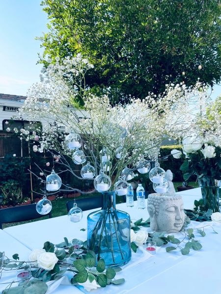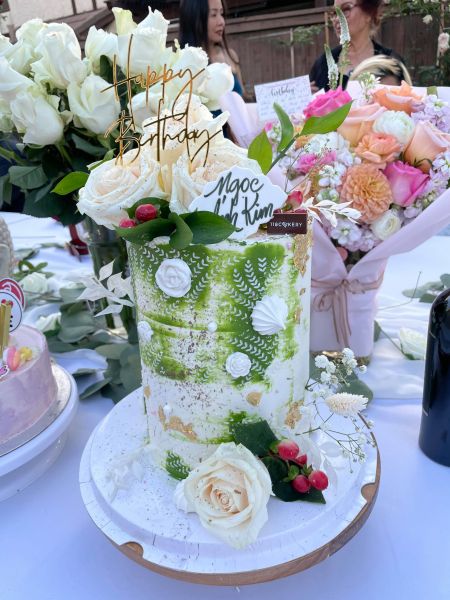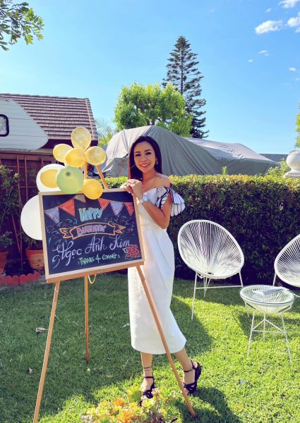 Yêu thích màu trắng và muốn có một buổi tiệc thật vui vẻ ấm cúng với bè bạn thân, Ngọc Ánh Kim đã bày trí khoảng sân vườn nhà xanh mướt thành không gian tiệc đẹp lung linh. Ngọc Ánh Kim và 2 người em tự tay lên ý tưởng trang trí chủ đề sinh nhật bạch hồng với hoa hồng trắng, bạch lạp - nến trắng, bóng bay được kết thành vòng tròn quanh chiếc xích đu phủ voan trắng tạo nên một sân khấu nho nhỏ thơ mộng.