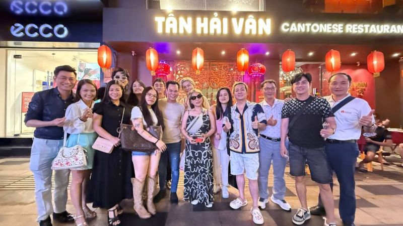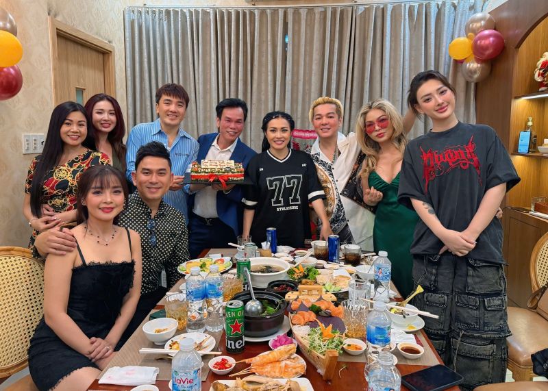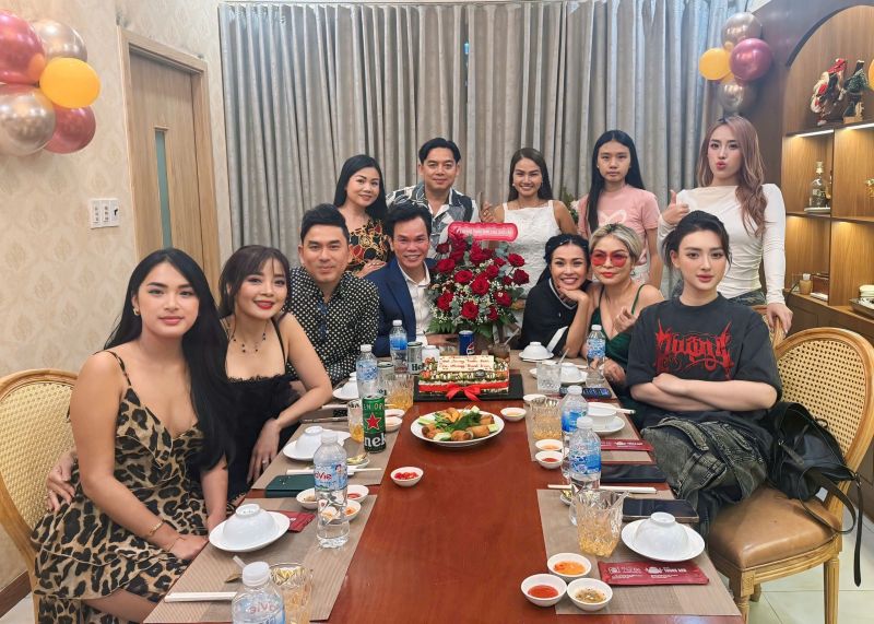 Các nghệ sĩ dùng cơm sau chương trình, đây là dịp để thắt chặt tình anh chị em nghệ sĩ. Hàng ngồi từ trái qua: Briana, Hồng Loan và ông xã,bầu show Quốc Tuấn, Ca sĩ Phương Thanh, Hoàng Thanh Trúc, Chu Thúy Quỳnh. Hàng đứng từ trái qua: Dương Hồng Loan và ông xã, Mai Thủy, Tâm Uyên, và quản lý Chu Thúy Quỳnh